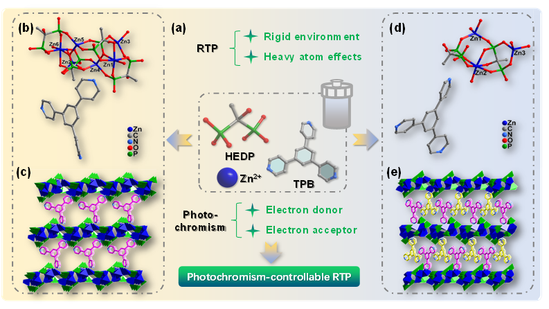 近日,青岛大学王国明教授团队和胡继祥教授、中山大学潘梅教授等人合作,通过水热法将电子给体羟基乙叉二膦酸(H4-HEDP)、具有室温磷光性能的电子受体1,3,5-三(4-吡啶基)苯(TPB)与金属锌自组装,获得两例兼具光致变色与室温磷光的锌基功能配合物(H3-TPB)?[Zn6(H-HEDP)(HEDP)3(H2O)2]?5H2O(配合物1)和(H-TPB)?[Zn3(H-HEDP)(HEDP)(H2O)]?2H2O(配合物2)。质子化的H3/1-TPB阳离子与膦酸锌层以氢键相互作用,不仅有效限制分子运动,抑制非辐射跃迁,实现室温磷光;同时为电子转移提供有效途径,获得电子转移型光致变色,为利用光致变色行为动态调节室温磷光提供可能。