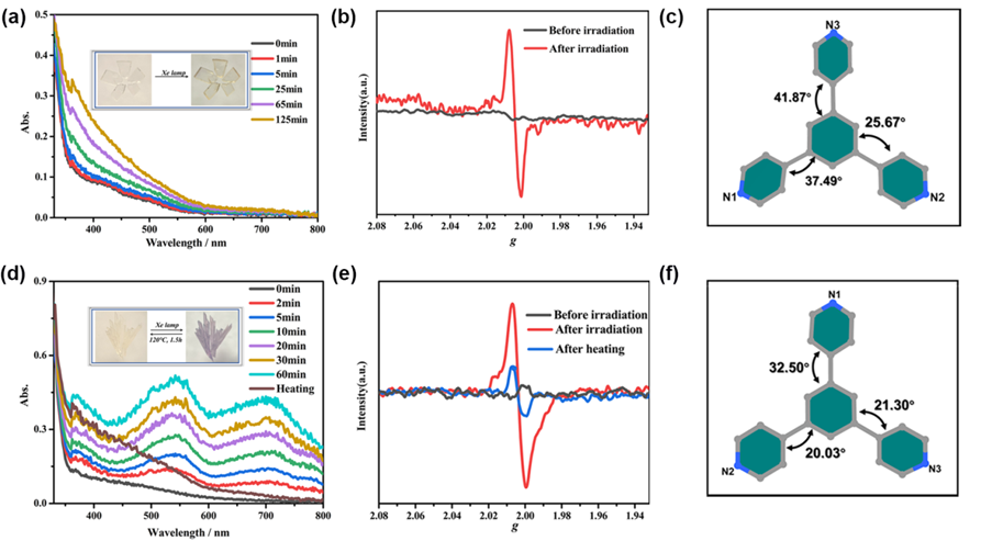 图2. 配合物1(a-c)和配合物2(d-f)的光致变色性质及配体构型