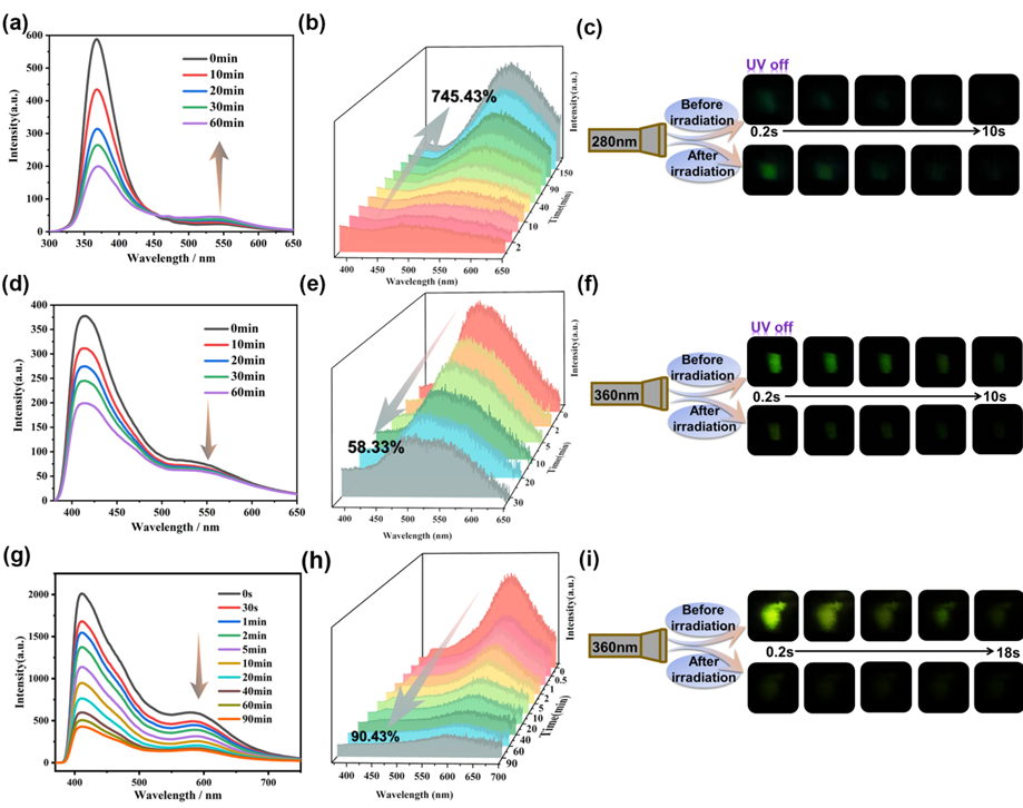 图3. 配合物1中光致变色诱导的室温磷光开启(a-c)和关闭过程(d-f);(g-i)配合物2中光致变色诱导的室温磷光关闭过程。