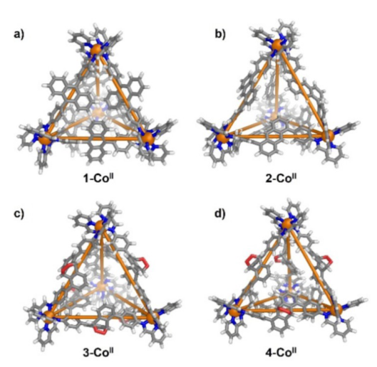 综上所述,作者证明了一系列基于蒽的四面体金属笼可以在异质狄尔斯-阿尔德反应中与光生单线态氧发生反应,环加成后的结构变化强烈影响笼的主客体化学。作者发现金属的选择会影响环加成的程度:铁(II)笼中的1O2当量比钴(II)笼少。添加单线态氧后,在特定条件下,还观察到修饰的笼子热恢复到其前体结构,从而允许其主客体结合特性的可逆调节。