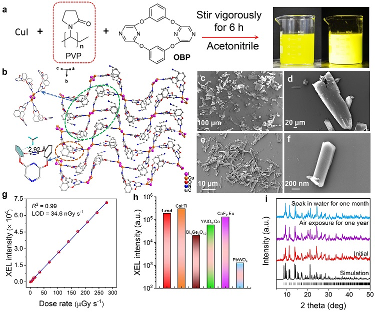 本研究以具有聚集诱导发光 (AIE) 特性的大环分子作为桥接配体,构建了基于铜碘簇的MOF闪烁体。AIE大环桥接配体的引入和紧凑框架结构的形成使其具有较高的XEL性能和优异的化学稳定性。在原位合成的过程中,作者在体系中加入了聚乙烯吡咯烷酮 (Polyvinyl pyrrolidone, PVP),使配体和CuI在PVP胶束中组装形成尺寸更小,形貌更规则的棒状微晶,进一步提高了闪烁体的发光强度和可加工性。铜碘簇基MOF微晶闪烁体在X-射线激发下能发射出明亮的发光,XEL强度可以媲美商品化闪烁体,最低检测限可以达到34.6 nGy s-1。同时,该闪烁体具有优异的水氧稳定性,容易保存且适于在极端环境中使用。