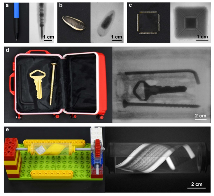 作者表示,利用铜碘簇基MOF微晶闪烁体制备的柔性闪烁体屏具有优异的柔韧性,该柔性闪烁体屏可用来对圆珠笔的内置弹簧、包含较轻元素的葵花籽和微芯片的内置密集电路进行X-射线成像。同时,内置金属制品的行李箱模型可以用来进行安检模拟实验,在X-射线照射下,在闪烁屏上可以看到箱子内部的金属扳手、钥匙、螺丝。更重要的是,覆盖闪烁体屏的柔性OLED显示屏经过S型弯曲后,在X-射线照射下,可以清晰地动态观察到曲面的内置电路。