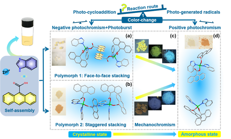 近期,北京师范大学化学学院闫东鹏教授课题组报道了利用蒽基配合物的晶态和非晶态来调节光诱导脱色和着色过程(称为逆向和正向光致变色)。在配合物晶型1中,相邻的蒽以面对面方式有序排列,为[4+4]环加成反应提供了先决条件。光照后,晶体表现出光致炸裂行为,实现了光能-化学能-机械能的转化;同时颜色从淡黄色变为白色,即逆向光致变色行为。其多晶型2中蒽以交错的方式排列,不具备发生环加成反应的结构基础。上述结果证实通过改变蒽的排列方式可有效控制光-力转换的发生(如下图)。