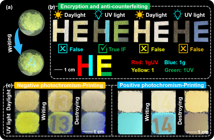 基于研磨导致的发光差异和双向光致变色行为,进一步展示了基于同一种化合物实现的丰富光学特性,在信息加密、防伪和光学打印中体现出应用前景。