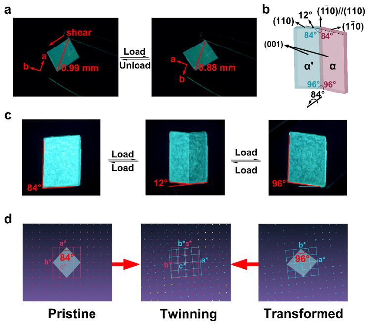 单晶X射线衍射的倒异空间分析发现,这种变形是由于单晶受力过程中产生孪晶相所导致。相较于初始晶体,孪晶晶格沿晶体学c轴90度转动,导致了正交晶体a轴和b轴的互换,并在界面处产生168度的结构钝角,这一结果与实验观察到的宏观晶体形变完全一致。