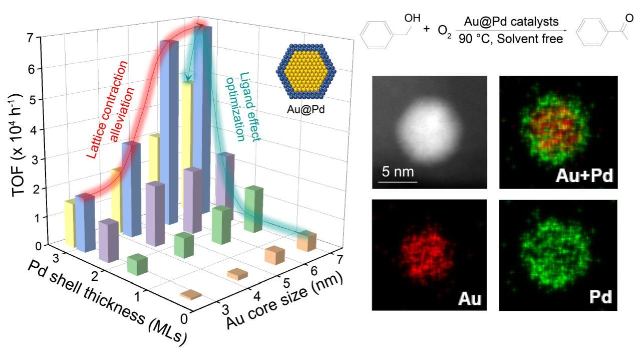 该联合研究团队展开实验和理论合作研究,以无溶剂苯甲醇选择性氧化为探针反应,基于原子层沉积技术(ALD)、多方位谱学和显微学表征以及密度泛函理论计算,首次揭示了Au@Pd核壳构型中Au核尺寸以及Pd壳层厚度调变诱发的双量子尺寸效应,并实现了反应性能的大幅提升(图1)。