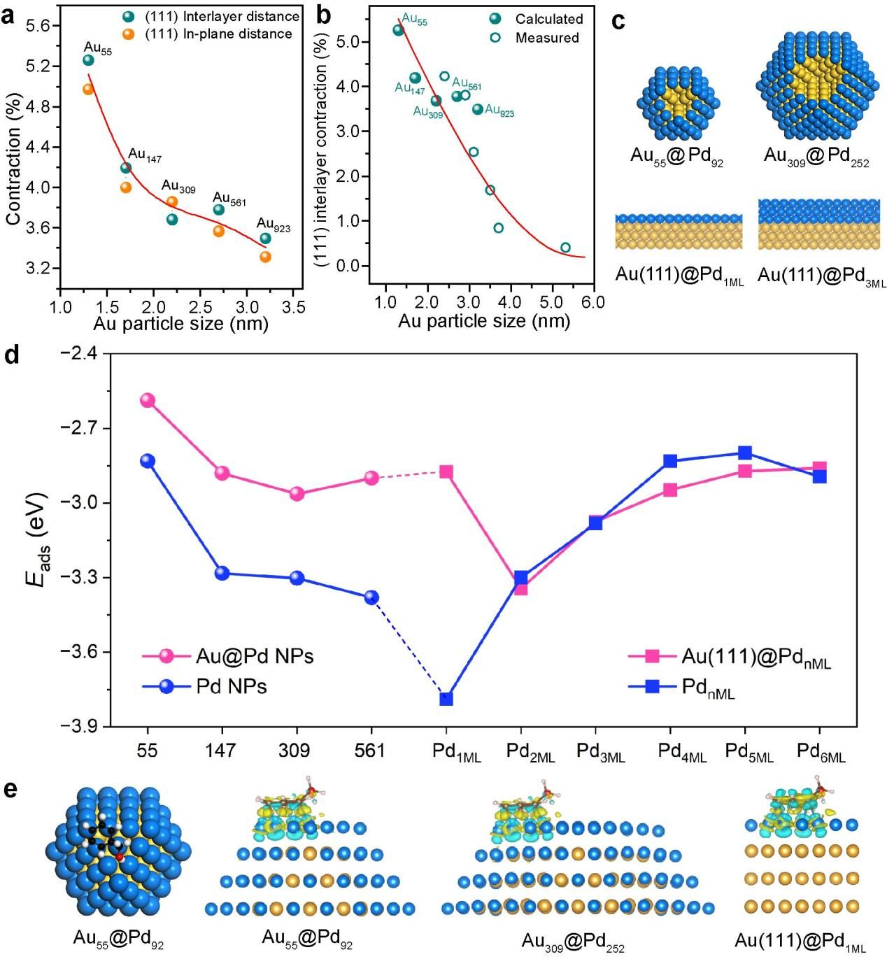图2. (a) 相对于体相Au的各种团簇(111)层间间距和面内间距的晶格收缩理论结果;(b) 不同金团簇/颗粒上(111)层间间距的理论收缩值与通过透射电子显微镜测量值的对比;(c) Au NPs@1ML-Pd团簇和Au(111)@nML-Pd平面模型;(d) Aux@yML-Pd 模型中苯甲醇的吸附能;(e) BzOH在不同模型上的吸附俯视图和侧视图.