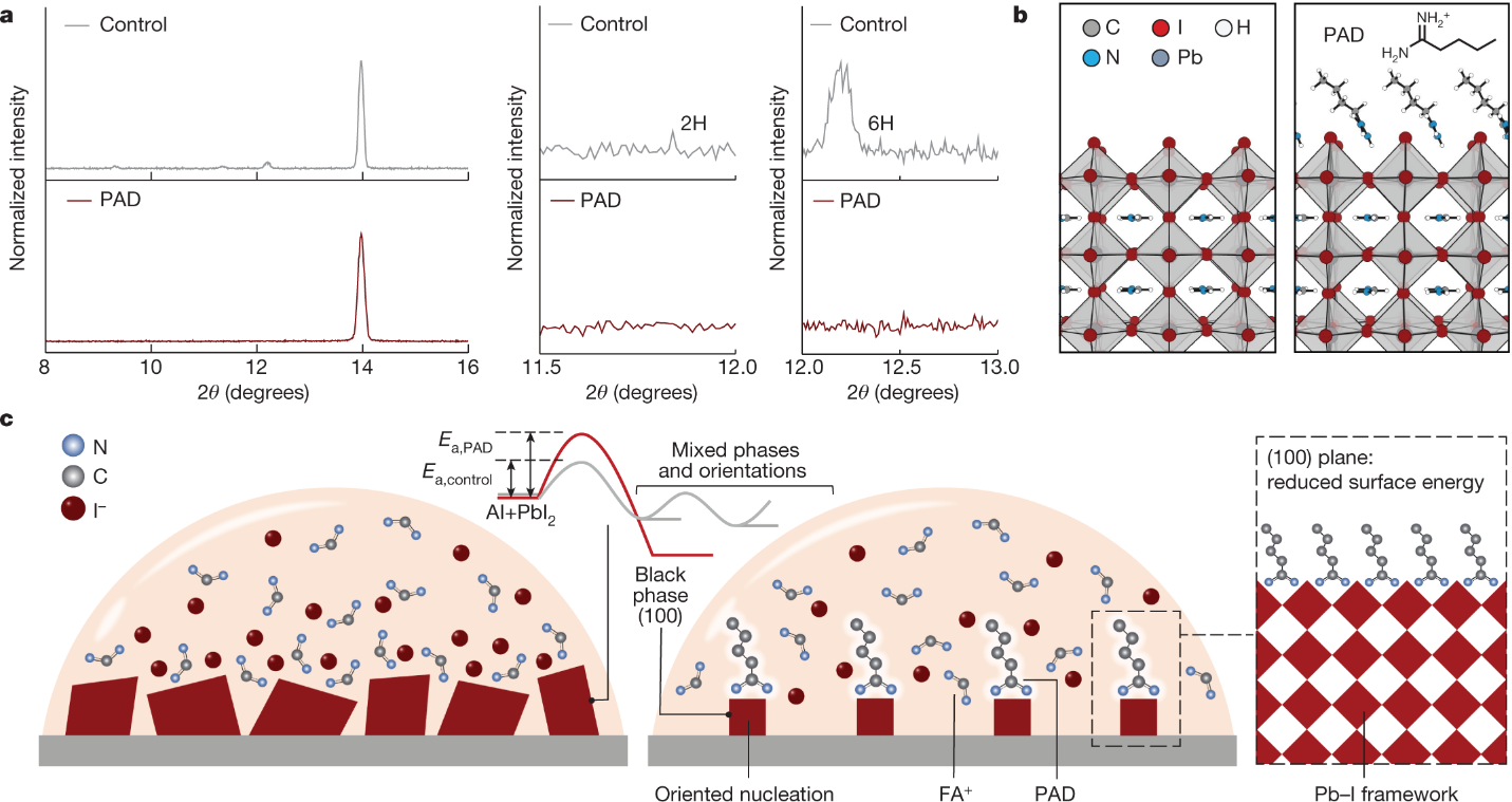 在钙钛矿薄膜过程中,预沉积PbI2和有机卤化物前体,总是会在室温下观察到非光活性的中间相。室温下沉积的钙钛矿薄膜的XRD图样显示了与黑相(100)面相应的衍射峰,同时伴随着2H和6H相的衍射峰。在有机阳离子的前体中加入戊脒(PAD)后,非光学活性相被消除。研究团队采用傅里叶变换红外光谱、XRD、结合密度泛函理论计算,研究了PAD与Pb-I框架的相互作用,并发现了黑相FAPbI3(100)晶面能的显著降低。这种热力学驱动力导致了黑相钙钛矿(100)晶面取向的优先形成,最终决定了结晶框架并促进了黑相钙钛矿晶体的形成。相比之下,没有PAD时相变过程的能量分布相对均匀,导致了多种相和取向的共存。