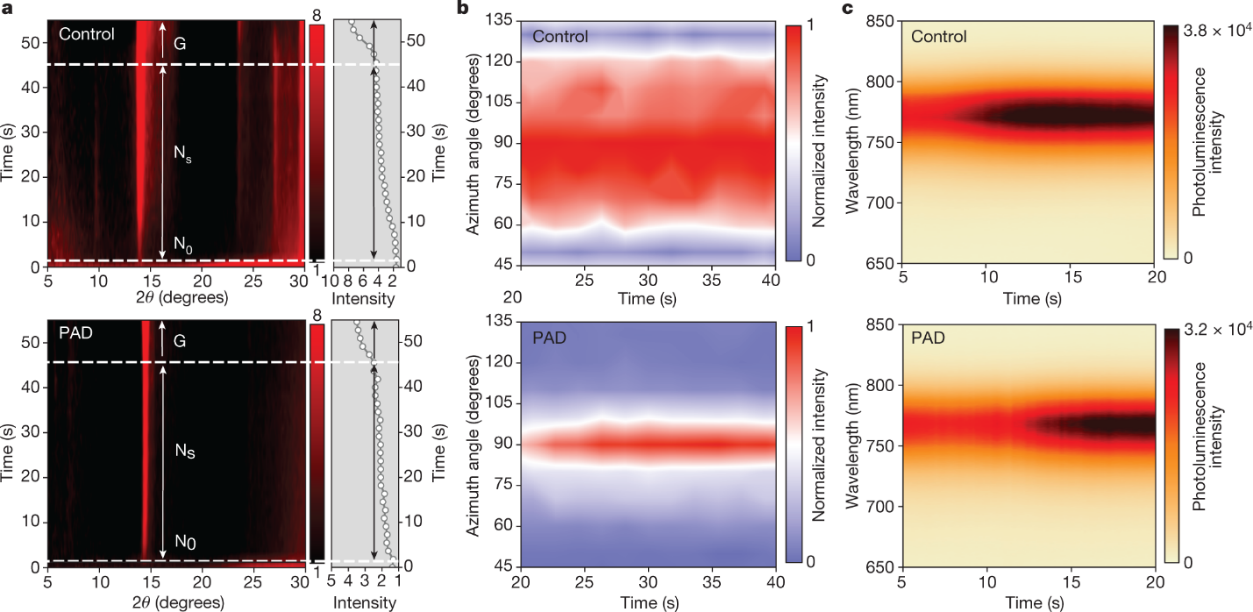 作者表示,该项研究通过捕捉钙钛矿的快速结晶过程,揭示了取向成核机制在实现FAPbI3晶相调控中的关键作用,为开发针对性的钙钛矿薄膜质量提升策略及其规模化沉积方案提供了重要的理论依据和技术探索。