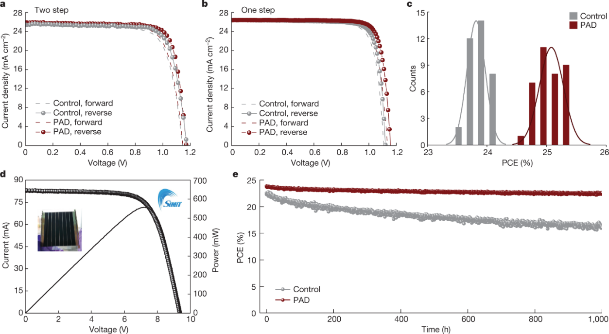 研究团队基于此优化了钙钛矿薄膜沉积策略,在两步法和一步法沉积工艺中分别实现了超过24%和25%的光电转换效率。研究团队进一步将其应用在了太阳能电池模组的制备中,在27.83 cm2的孔径面积上实现了高达21.4%的孔径效率,并经第三方机构认证。制备出的太阳能电池器件还表现出明显改善的工作稳定性。在30±3 ℃的恒定照明下以最大功率点进行跟踪时,器件在1000多小时后仍保持了初始效率的95%,而在相同条件下对照组器件的光电转换效率下降了30%。