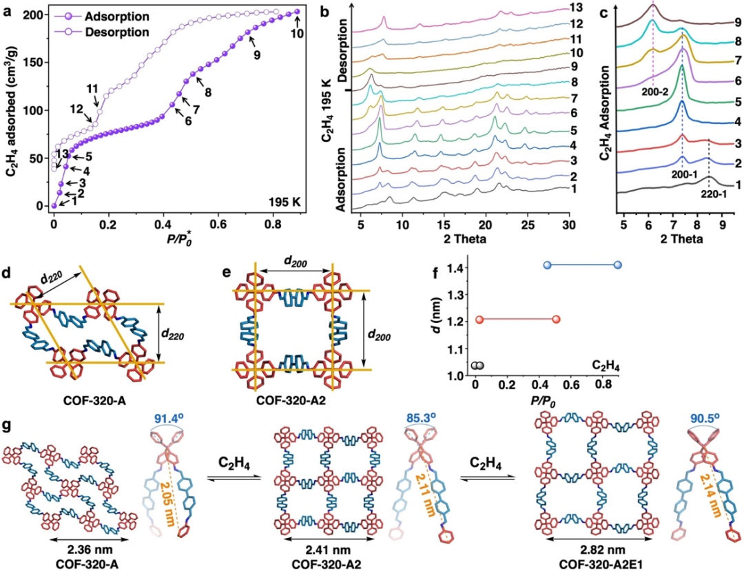 )则具有特殊的气体吸附柔性行为。该团队与日本名古屋大学松田亮太郎(Ryotaro Matsuda)教授团队合作,利用原位气体吸附—粉晶X射线衍射表征发现新合成的COF阻旋异构体具有多种晶体结构转换模式:吸附乙烯时,COF阻旋异构体呈现不连续的晶体结构转变;吸附二氧化碳时则呈现连续的晶体结构变化;但在吸附乙炔时,则连续与不连续晶体结构变化同时存在于一个体系中。