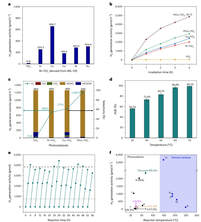 图1:光催化甲醇和水制氢性能和稳定性。(a)在负载有各种金属的MOF衍生的M-TiO2,(b)催化剂性能,(c)样品的选择性,(d)PtCu-TiO2在不同温度的AQE,(e)PtCu-TiO2催化剂的稳定性测试7天运行。(f)所报道的基准光催化剂和热催化剂的活性(1)0.75%Cu-TiO2,(2)i-Pt-TiO2,(3)Ni(OH)2/TiO2,(4)34%Cu-TiO2,(5)3%Li-TiO2,(6)FP-0.5%Pt-TiO2,(7)0.188%Pt-NYTiO2,(8)1.5%Cu- TiO2,(9)Pt-TS-1 zeolite,(10)Cu-Zn-Ti,(11)2%Pt-TiO2,(12)2%Pt-Al2O3,(13)2%Pt1/MoC。