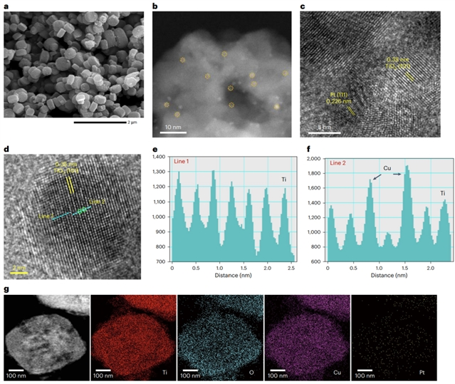 图2:催化剂的形貌。(a)SEM,(b)带有Pt的ADF STEM,用黄色圆圈标记,(c-d)带有TiO2(101)和Pt(111)晶体的PtCu-TiO2的高转TEM晶格图像,对应的线扫描轮廓用D标记,(e)线1(仅Ti)和(f)线2(Cu原子的两个亮点用绿色圆圈标记)。(g)PtCu-TiO2的ADF STEM和相应的元素图谱。