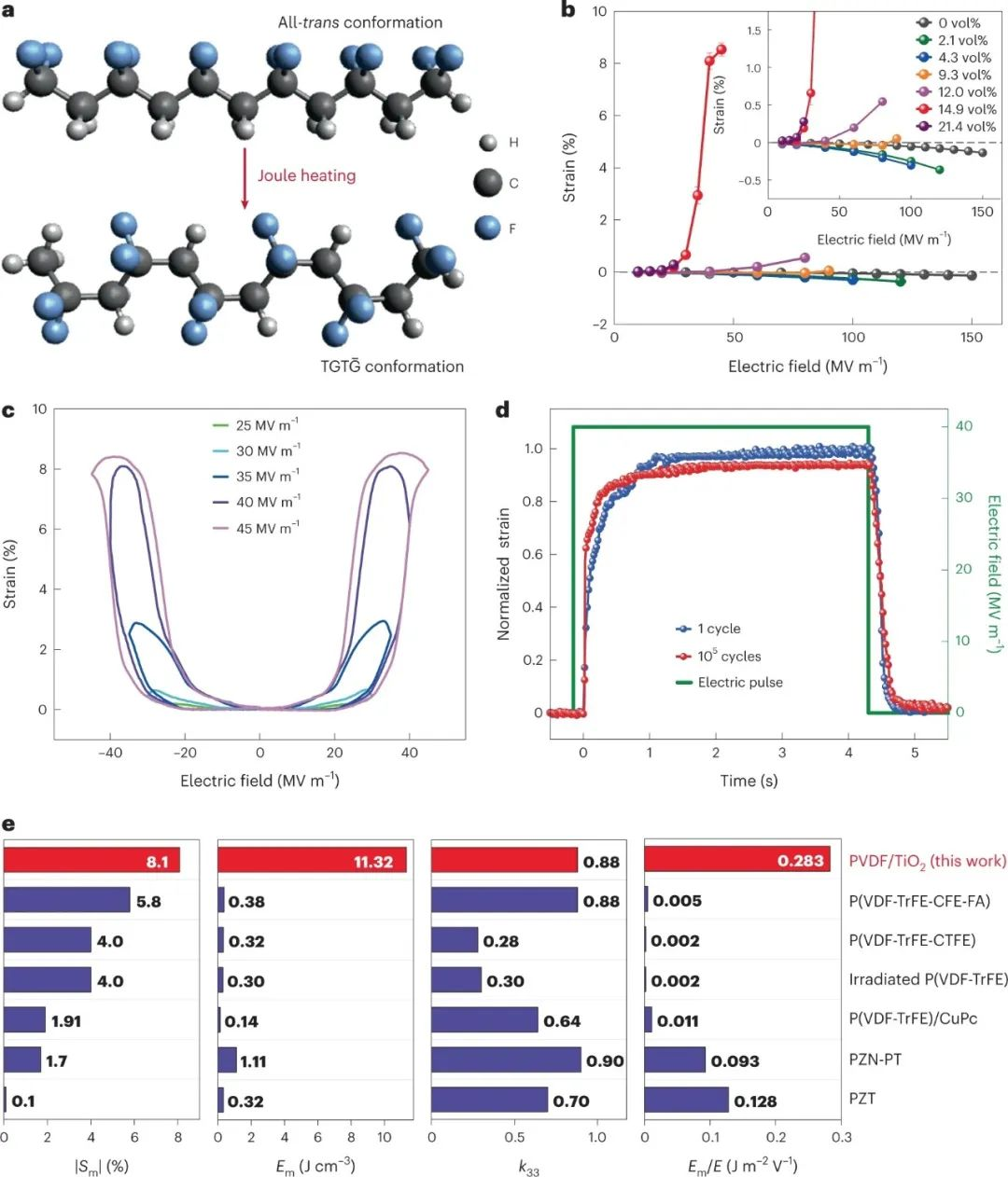 鉴于此,受启发于合金基电热驱动器的基本原理(利用电流产生焦耳热导致形状记忆合金发生马氏体-奥氏体结构相变从而产生大应变),团队提出界面调控铁电聚合物纳米复合材料电热驱动的新概念。区别于传统驱动铁电材料的机制,在电热驱动中,界面相在外加电场产生的焦耳热诱导下发生铁电-顺电结构相变(图1a),从而产生大应变。外加电场主要贡献是提供复合材料内部电流导通路径产生焦耳热,不依赖高电场。因此,低电场下有望能够产生优异的驱动性能,在驱动器应用上有巨大的应用前景。比如,电热驱动产生的弹性能量密度为(11.3 J/cm3),与电致伸缩驱动、压电驱动等性能相比优势十分明显(图1e),并且在105次循环电场作用下仍无发生明显疲劳行为(图1d)。
