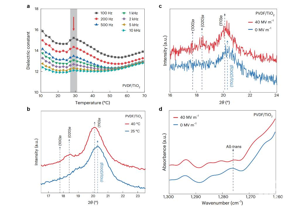 图2:电热相变的实验证据。a, 介电温谱;b, 变温X射线衍射;c, 变场X射线衍射;d, 变场红外光谱。