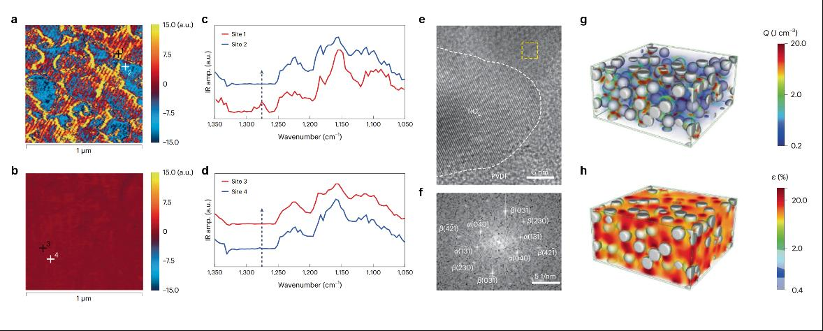 图3:微观结构表征。a-d, 纳米红外光谱;e,f, 高清电镜结果;g,f,相场模拟结果。
