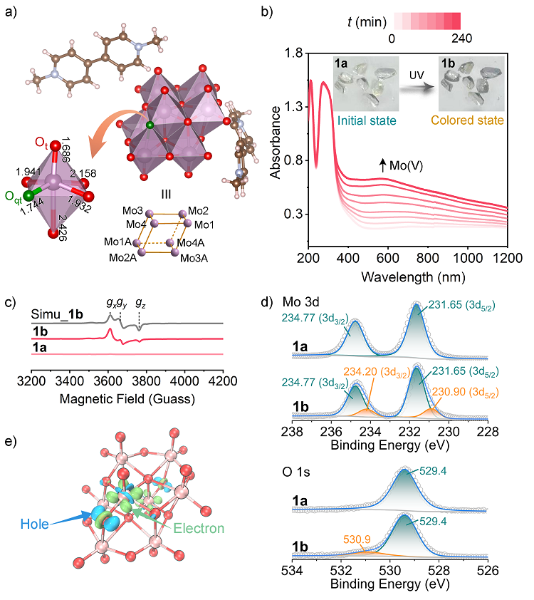 通过紫外光辐照,多钼氧酸盐1由无色(1a)变为灰色(1b)。电子顺磁共振(EPR)证实了辐照后MoV的出现和光诱导电子转移的发生。X射线光电子能谱(XPS)进一步表明Mo是电子受体,O原子为电子给体。电子密度差( )计算结果展示了在光照下电子从准端氧(Oqt)转移到相邻的Mo,在Oqt留下空穴,从而形成超稳定的电荷分离态。