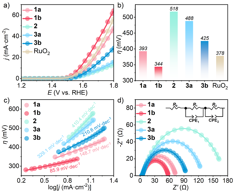 图2. OER的电催化性能。a) 样品1a、1b、2、3a、3b和商用RuO2在氧气饱和的0.1 M PBS溶液中的LSV曲线,扫描速率为5 mV s-1;b) 10 mA cm-2电流密度下的过电位;c) Tafel斜率;d) 在1.60 V(RHE)的外加电压下获得的奈奎斯特图与和对应等效电路图(插图)。图来源:Angew. Chem. Int. Ed.