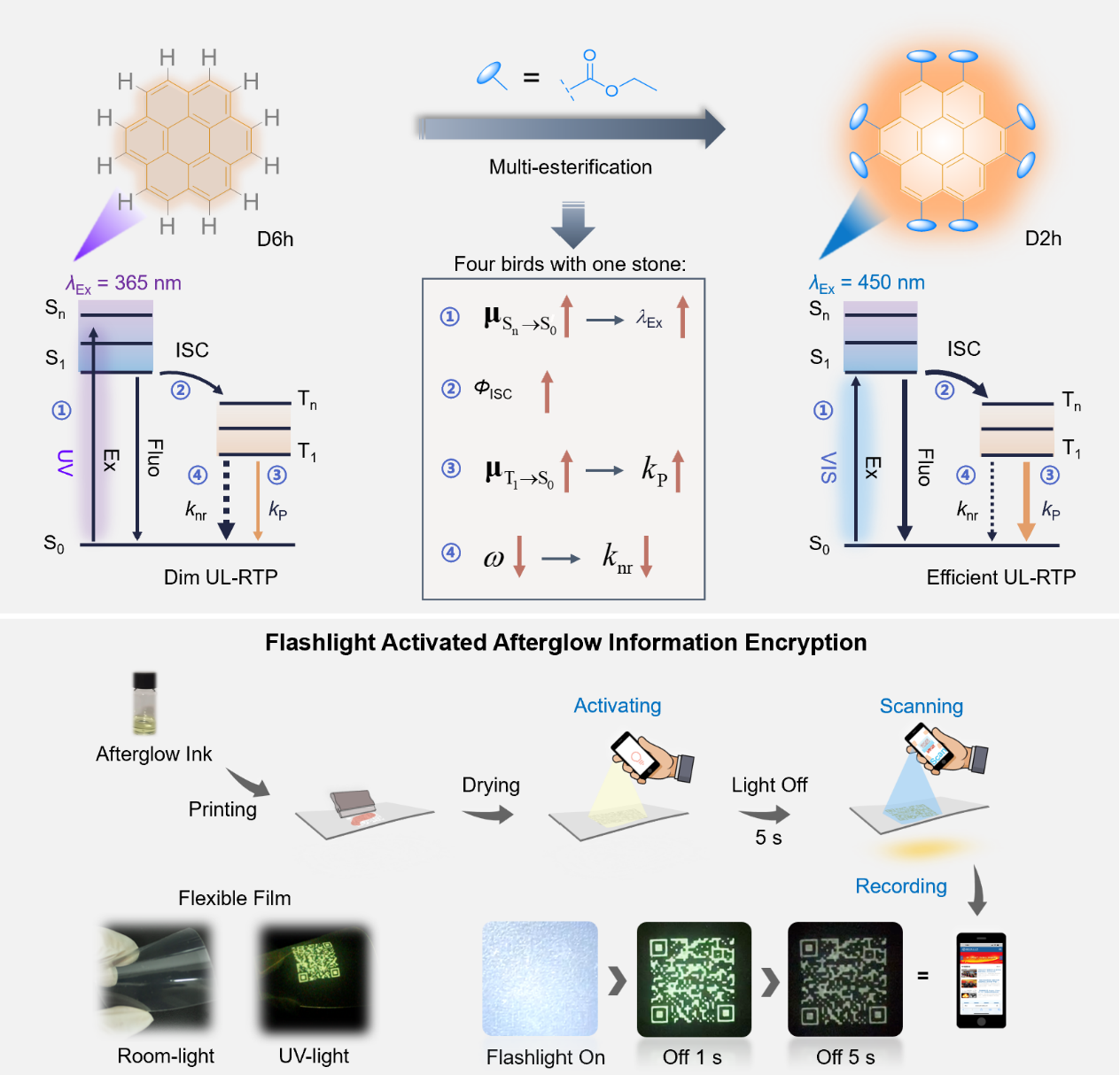 近日,华东理工大学朱为宏院士、赵伟军特聘研究员课题组在具有普适性的磷光分子设计策略及其光物理机制研究中取得新进展,相关研究成果以“Efficient Visible-Light-Activated Ultra-Long Room-Temperature Phosphorescence Triggered by Multi-Esterification”为题发表于《德国应用化学》期刊上(Angew. Chem. Int. Ed., 2023, DOI: 10.1002/anie.202316647)。在该研究中,利用对刚性平面磷光核心进行多酯化改建,引发磷光分子光物理过程中低能级单线态和三线态跃迁偶极矩的大幅提升,从而实现一系列可见光激活型的高效率UL-RTP薄膜材料(在蓝光激发下,寿命长达2.01秒,效率高达35.4%)。基于超高性能的UL-RTP薄膜材料,该工作还开拓了其在延时白光照明及余辉加密技术中的新应用。该研究为设计高性能UL-RTP分子的设计提供了新途径和理论基础。