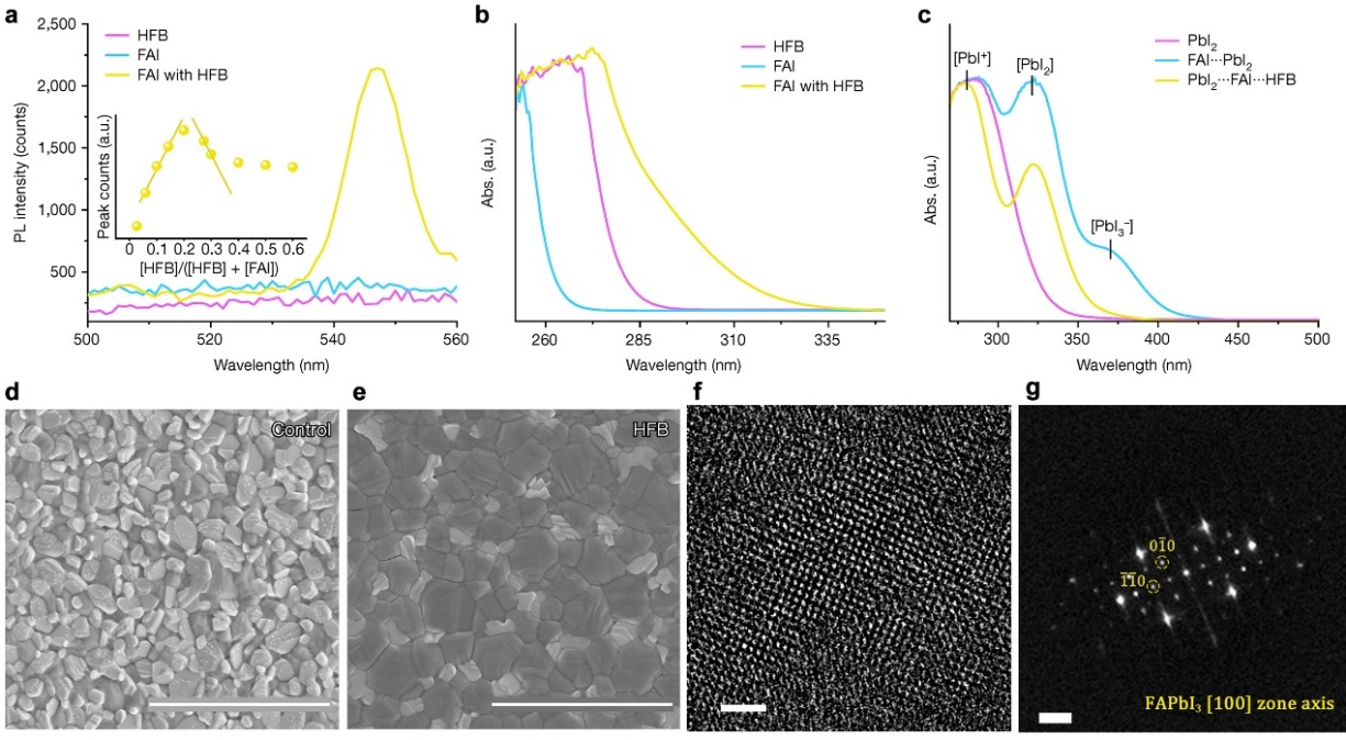 阴离子- 相互作用的存在性和效果。a,b,FAI、六氟苯及其混合物的荧光光谱(a)与吸收光谱(b);c,PbI2, FAI PbI2混合物及PbI2 FAI HFB三元混合物的吸收光谱;d,e,引入阴离子- 相互作用前后钙钛矿薄膜的扫描电子显微镜图像;f,g,引入阴离子- 相互作用的钙钛矿的透射电子显微镜图像(f)及电子衍射图案(g)。图来源:Nature