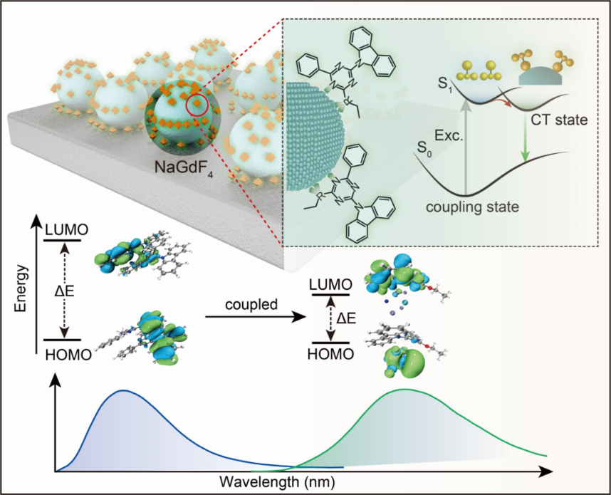 图1. 利用无机镧系纳米晶表面耦合效应实现有机光电功能分子的激发态调控过程示意图