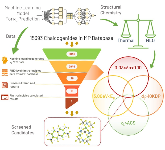 近日,中国科学院理化技术研究所林哲帅团队发展了一种基于机器学习的中红外非线性光学材料筛选新策略,并利用该方法在硫属化合物这一中红外非线性光学材料的常见候选体系中筛选了若干种潜在的具有平衡的热输运和光学性能的中红外非线性光学材料。他们结合低精度的热导率半经验方法计算数据和高精度的实验测量数据,利用迁移学习(Transfer Learning, TL)手段,建立了基于晶体图神经网络(Crystal Graph Convolutional Neural Network, CGCNN)算法的晶格热导率回归预测模型,在测试集上获得了与半经验计算方法相当的预测精度,大大减少了粗略评估晶格热输运性能所需的计算资源和时间。研究人员对Materials Project数据库中收录的6000余种非中心对称硫属化合物进行了晶格热导率预测,根据热导率预测值、带隙和总能等标准筛选出78种材料,其中39种已被报道为非线性光学材料。通过进一步对未经报道的材料进行第一性原理计算,2种兼具大倍频效应、高晶格热导率、宽带隙和适宜双折射率的潜在中红外非线性光学材料Li2SiS3和AlZnGaS4被筛选出来,且其第一性原理计算获得的高晶格热导率数值与机器学习预测值相接近,证实了预测工具的可靠性。