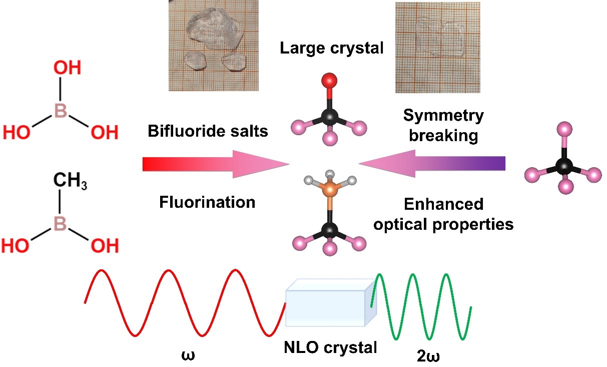 短波长光学晶体作为固态激光器的关键部件,在调谐激光频率,调制激光偏振态以及实现光源透过等方面具有重要作用。氟化策略可对含氧酸盐进行化学和功能修饰,从而促进发现具有其他氧化物母体中未发现的结构和性质的含氟化合物。因此,氟化策略在化学和材料等相关研究中一直很重要,特别是在医学、电池材料、电化学和光学晶体等领域。