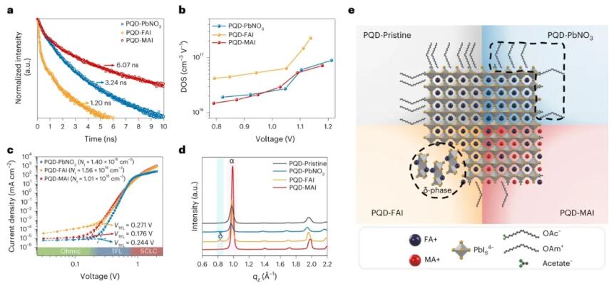 在基于钙钛矿的 CQD (PQD) 中,环境稳定的光活性α相钙钛矿晶体是通过纳米尺度的配体辅助表面应变实现的。此外,PQD 的光电特性可以通过改变其成分、尺寸和形状来控制。在太阳能电池应用中,与传统CQD相比,PQD 的陷阱密度较低,可抑制非辐射电荷复合,从而实现卓越的外量子效率 (EQE),同时减少能量损失。从加工角度来看,PQD 通过将结晶过程与沉积过程分开,在工业制造中比钙钛矿薄膜具有优势。与主要依靠二甲基甲酰胺进行加工的钙钛矿薄膜相比,这一特性还允许使用更环保的溶剂(例如正辛烷、乙酸甲酯和乙酸乙酯)。