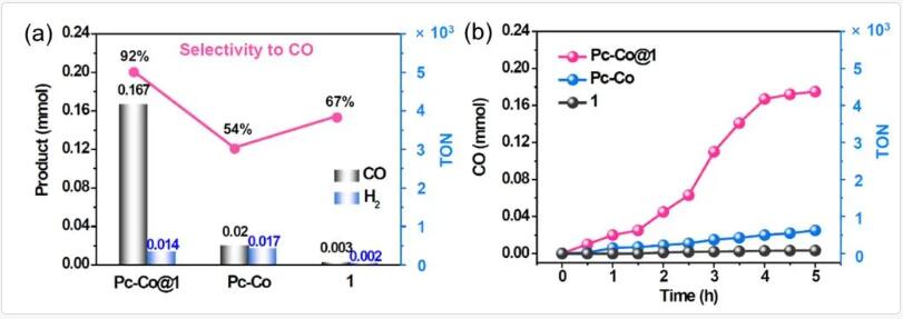 图3. 催化剂Pc-Co@1, Pc-Co和金属笼1的光催化CO2还原性能