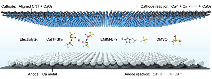 在基于金属钙的电池中,钙-氧气电池具有最高的理论能量密度,但目前的钙-氧气电池尚未实现在室温下稳定充放电。其关键挑战在于,钙金属负极具有高电化学活性,容易导致电解液被还原分解并在电极表面形成钝化层,使得钙金属负极失效;空气正极具有高电极电势,容易导致电解液氧化分解,正极电化学性能迅速衰退。目前,仍难以找到一种能与钙金属负极相匹配,且能适应高电极电势空气正极的电解质,严重制约了钙-氧气电池的发展。