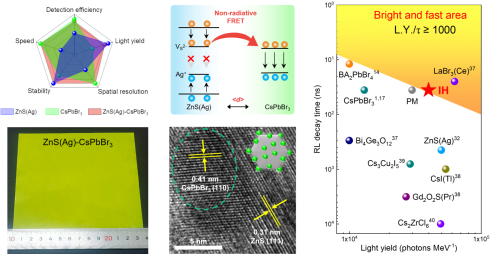 针对CsPbBr3QDs闪烁体光产额低、制备工艺兼容性差的问题,郑州大学杨智、宋继中等人设计了一种多位点ZnS(Ag)-CsPbBr3异质结,提出了原位固相合成策略制备异质结闪烁体。基于光谱匹配和短D-A距离特性,通过稳态RL光谱进化,瞬态吸收和瞬态PL谱证明了ZnS(Ag)给体到CsPbBr3受体发生了高效的福斯特共振能量转移(FRET),使得异质结闪烁体获得了光产额40,000 photons/ MeV,明显高于直接物理混合闪烁体的30,000 photons/MeV,证明了FRET导致的辐射增强可以在一定程度上弥补自吸收光损失。同时异质结闪烁体具有36 ns的快发光衰减时间和高的空间分辨率30 lp/mm。基于高光产额、快发光和高分辨成像的优势,异质结闪烁体展示了优异的高速动态X-ray成像性能,模拟了医学高速血管造影,在200帧/秒的速度和10 mGyairs−1剂量率下观察到11 cm/s的碘对比剂液流速度。总之,该工作为设计和制造高性能异质闪烁体提供了新的方案,展示了兼具快和亮的闪烁体在实时X射线成像中的重要作用。