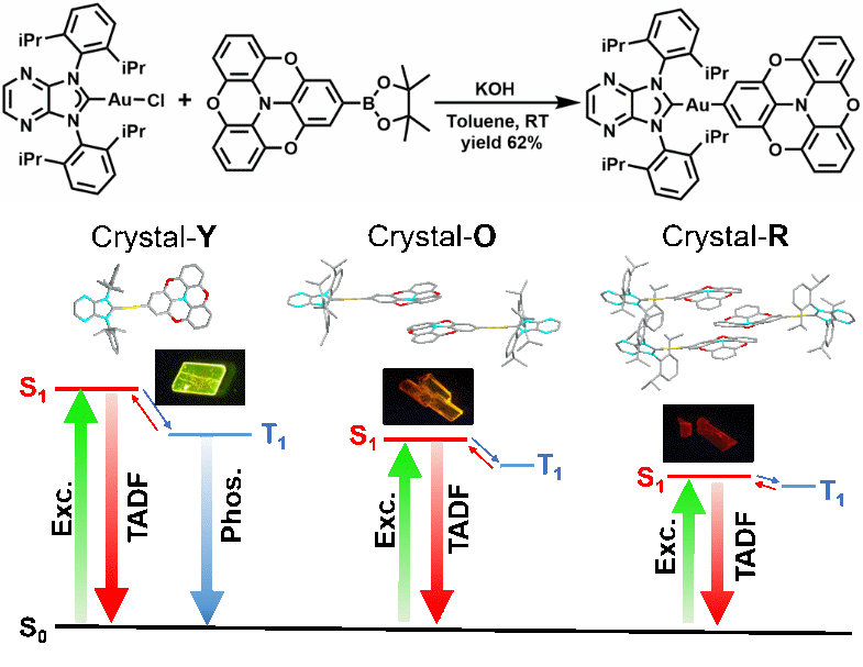 近日,中国科学院理化所陈勇研究员团队和深圳大学李凯教授合作,利用“给体-金属-受体”(D-M-A)型配合物灵活旋转的结构特性,通过调控分子聚集态,在单一分子(PZI-Au-TOT)中同时实现了热活化延迟荧光、同质多晶和线偏振发光。PZI-Au-TOT在掺杂薄膜中发光量子产率达到93%;在不同的结晶条件下,组装得到发光颜色从黄绿色到红色的三种晶体(Y、O和R)。机理研究表明形貌依赖的发光与其晶体中分子间相互作用以及堆积方式密切相关。此外,微晶Y和O具有良好的线偏振发光特性,偏振度可达0.64。这是首例关于线偏振热活化延迟荧光D-M-A配合物的报道。