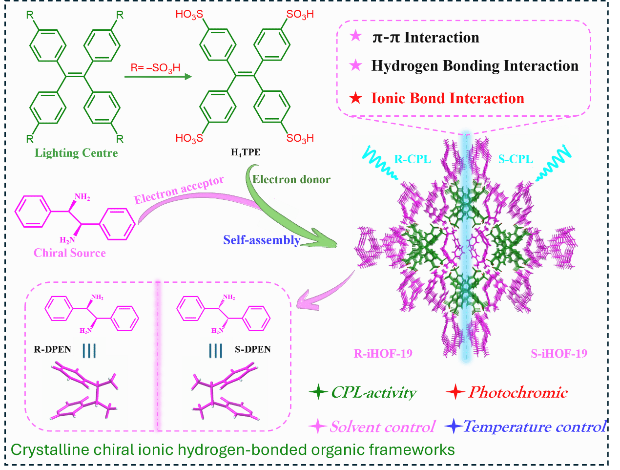 近日,陕西科技大学曹丽慧教授团队通过离子型氢键有机框架(iHOFs)具有丰富的氢键受体和多样性的结构框架特性;利用它(分子共轭、质子化效应、电荷转移和可逆结构转变)不同的光衰减路径,设计得到了R/S-iHOF-19多功能的光学功能集合体。另外,氢键的键能要低于共价键的键能,更容易实现局部位点的断键和二次成键,达到对材料性能的进一步精准调控。实现了刺激响应型低温光致变色、荧光、圆偏振发光等多种光学功能集成的晶态手性框架构筑。并且探索了R/S-iHOF-19未来在多重高级加密防伪方面的潜在应用。相关工作以“Temperature and Solvent Dual Switch Photochromic Chiral Ionic Hydrogen-Bonded Organic Framework for Circularly Polarized Luminescence and Advanced Encryption”为题发表在《德国应用化学》期刊上(DOI: 10.1002/anie.202504645)。