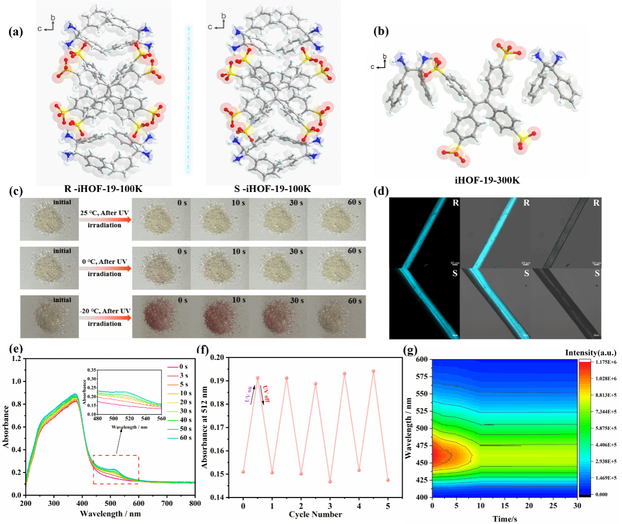 (1). R/S-iHOF-19充分发挥其结构灵活性和氢键的动态特性,实现材料性能的精准调控。通过调控结构框架中的溶剂(水和甲醇)分子的得失可以控制光致变色的开关。实现了具有温度、溶剂双重控制的智能响应光致变色材料的探索和合成。