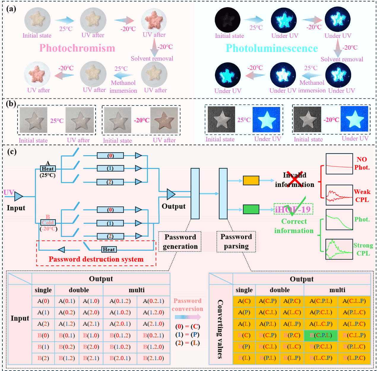 (3). R/S-iHOF-19首次将离子型氢键有机框架材料应用于光致变色和CPL材料交叉领域。将光致变色特性与圆偏振发光特性集成于同一材料体系中,实现光响应与手性发光的协同作用。实现了在同一个分子结构中将温度、溶剂双重控制的智能响应光致变色和圆偏振发光性实现完美的集成融合,并对其构效关系和相互作用机理进行深入的研究和讨论。并且,结合多学科特性,将光致变色和CPL技术与信息加密需求匹配,推动功能晶态材料在信息加密领域的创新应用。