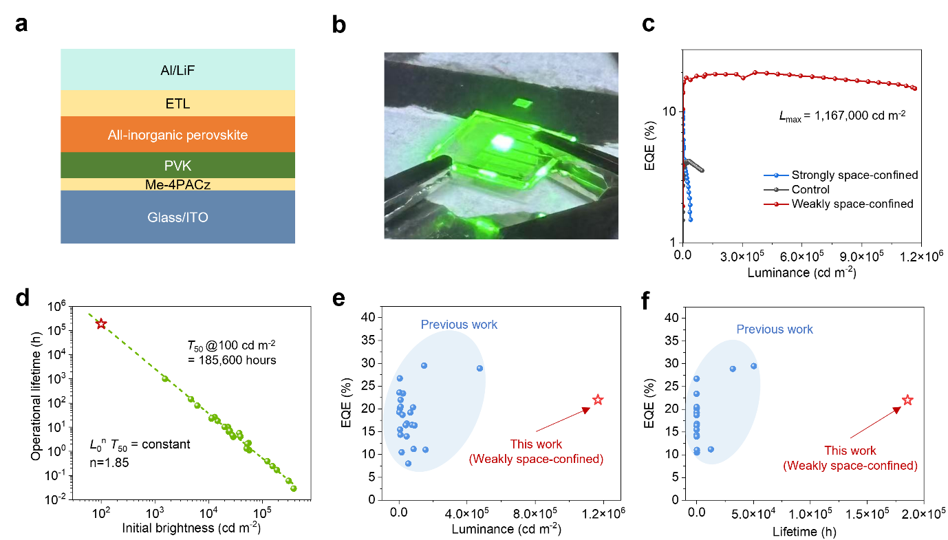 图2a.钙钛矿LED结构;b.钙钛矿LED工作时照片;c.三种不同空间限域钙钛矿LED的亮度和效率关系曲线;d.弱空间限域钙钛矿LED寿命外推拟合曲线;e, f.目前已发表的绿光钙钛矿LED效率分别和亮度(e),寿命(f)的统计