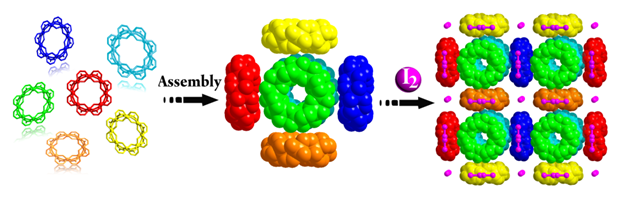 )。超分子纳米笼不仅可以宏量制备而且具有很好的热稳定性。碘蒸气吸附实验表明这类超分子纳米笼具有较好的碘吸附性能(50.3 wt %)。重要的是研究人员通过单晶X射线衍射明确了碘分子的吸附位点:碘分子在I…π(4.72