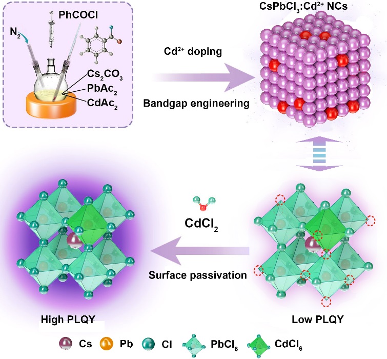 图1、基于能带和表面结构调控实现CsPbCl3纳米晶高效紫外发光示意图