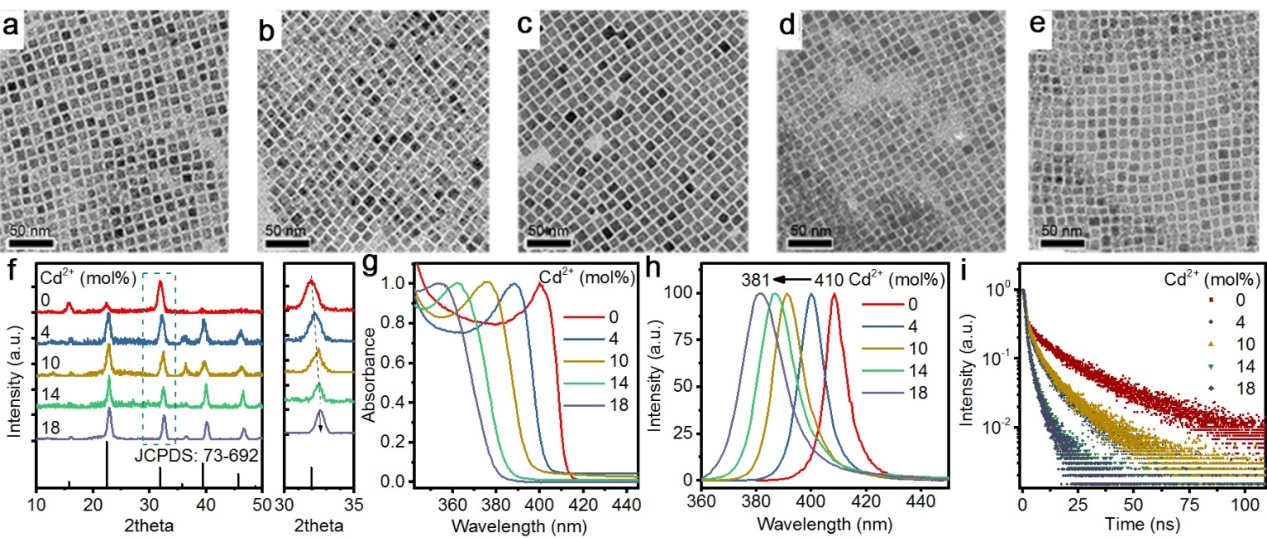 图2、(a)CsPbCl3纳米晶和(b-e)不同Cd2+浓度掺杂CsPbCl3纳米晶的明场透射电镜照片。CsPbCl3纳米晶以及不同Cd2+浓度掺杂CsPbCl3纳米晶的(f)X射线衍射谱,(g)吸收光谱,(h)发射光谱,和(i)荧光衰减曲线。