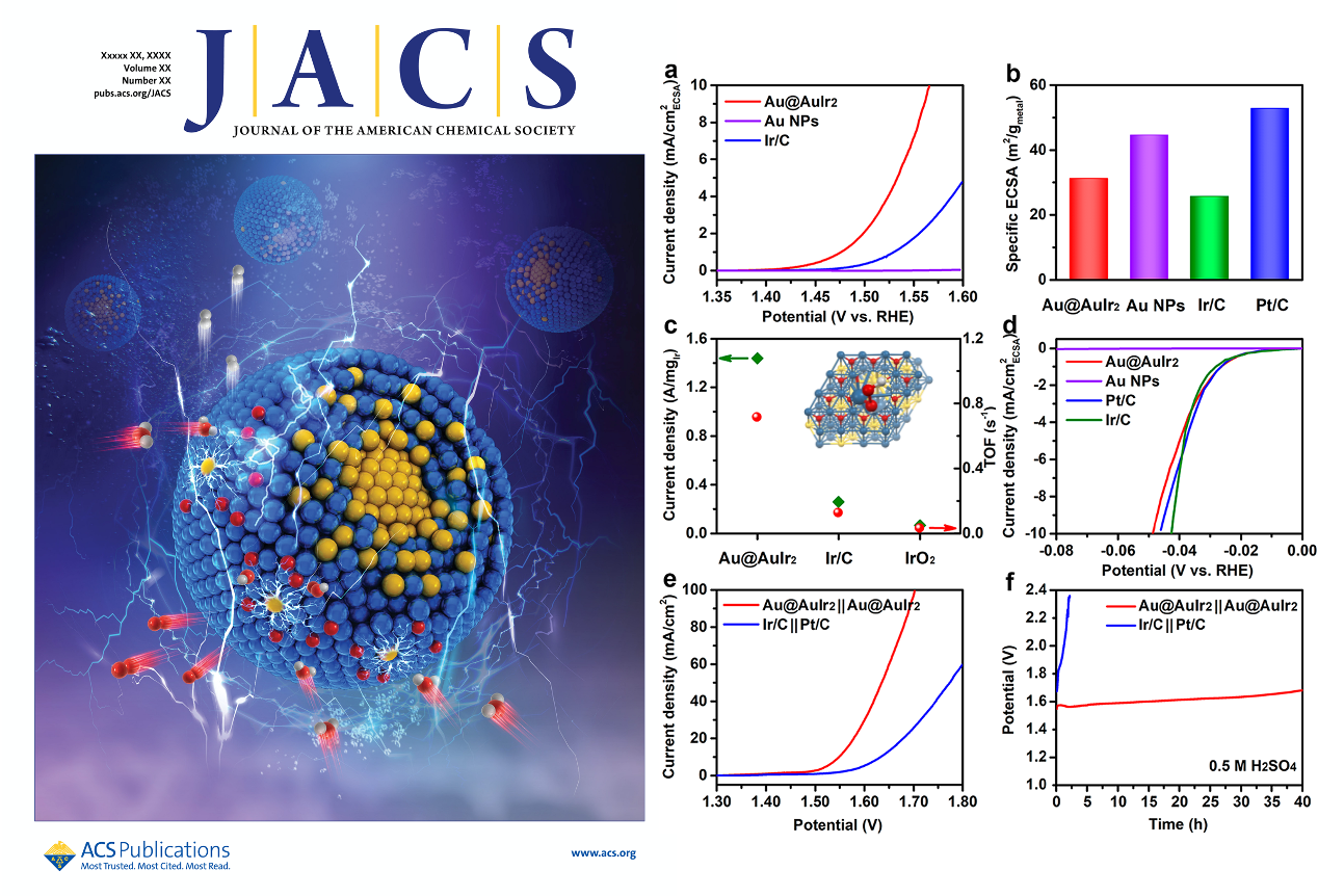在国家自然科学基金、国家重点项目、中科院战略性先导科技专项、前沿科学重点研究项目和福建省自然科学基金的支持下,福建物质结构研究所曹荣研究员和曹敏纳研究员研究团队设计并合成了表面部分氧化的Au@AuIr2核壳合金纳米催化剂,该材料表现出优异的电催化分解水的性能。Ir基纳米材料作为酸性条件下最有效的OER催化剂被广泛研究,尤其是在不牺牲催化活性和稳定性的基础上提高原子利用率以最大化利用存储稀少的贵金属,以期能够满足商业化需求。在酸性条件下,Au@AuIr2表现出优异的催化活性,其本征活性和质量活性分别是市售Ir催化剂的4.6和5.6倍。此外,Au@AuIr2还显示出了可与市售Pt/C相当的HER催化性能。更重要的是,当使用Au@AuIr2作为阳极和阴极催化剂用于全解水时,在1.55 V的工作电压下就可达到10 mA/cm2,并能够保持这种活性达40小时,远远优于商业Ir/C||Pt/C(1.63 V,活性在数分钟内下降)以及目前文献报道的绝大多数催化材料。利用X-射线吸收光谱和理论计算,证实Au和Ir之间的电子相互作用导致部分氧化表面的产生,部分氧化的表面为不同的中间体结合提供了平衡,并实现了显著增强的OER性能。在结构表征和性能测试结果的基础上,中国科学院福建物质结构研究所庄巍课题组研究团队的陈浙宁副研究员通过密度泛函理论计算(DFT)进一步验证了相对于表面无氧化的催化剂而言,表面部分氧化的Au@AuIr2核壳合金纳米颗粒具有更有效的OER催化性能。该工作从原子尺度上实现了核壳合金纳米结构以及电子结构的调控,有助于理解催化剂结构与性能之间的构效关系,为材料设计提供了思路,通过表面氧化和材料组成的合理设计可以使不同中间体的结合达到适当的平衡,不仅更大限度的提升了催化剂的活性,稳定性也极大的提升了贵金属催化剂的利用效率。该论文第一作者为博士研究生王慧敏,研究成果发表在Journal of the American Chemical Society并被编辑选为该期的Supplementary Cover Graphic(DOI:10.1021/jacs.0c12740)。