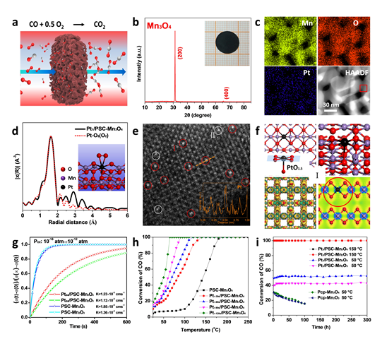 在国家重点研发计划变革性技术关键科学问题重点专项、国家基金重大研究计划重点项目、中科院洁净能源联合基金和中科院战略性先导科技专项(B类)等项目支持下,中科院功能纳米结构设计与组装/福建省纳米材料重点实验室谢奎课题组通过晶格重构策略生长出了具有三维连通孔道结构的介孔Mn2O3和Mn3O4厘米尺寸单晶,通过负载Pt在表面晶格中构建了孤立的结构精细的PtO1.5和PtO1.4活性中心。局域结构中,与Pt离子相连的晶格氧更容易活化,表面氧交换系数因此提高了7-8倍。多孔单晶整体式催化材料65°C实现CO完全氧化,运行300小时性能无衰减。多孔单晶整体催化材料对构筑表界面精细结构具有独特优势,对实际催化反应表界面催化机制研究具有重要意义。