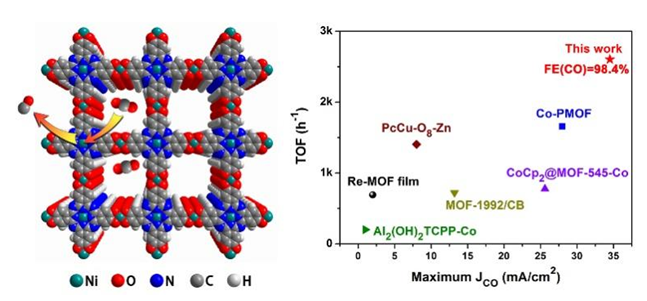近日,中科院福建物构所结构化学国家重点实验室曹荣和黄远标团队,在科技部重点研发计划、国家自然科学基金项目、中科院战略性先导科技专项、中科院青促会优秀会员项目资助下,选用具有大环共轭结构的八羟基酞菁镍分子作为配体,通过溶剂热方法合成得到二维导电MOF。将其经过超声剥离后,得到超薄二维纳米片,厚度为1.65 nm左右。材料具有优良的本征导电性(4.8′ 10-5 S m-1)。将该MOF直接应用于CO2电还原测试体系中,CO选择性最高可达98.4%,CO部分电流密度最高可达34.5 mA cm-2,超过了目前报道的MOFs催化剂并可以媲美碳基单原子催化剂。同时其在较宽的电位区间内(-0.65 V ~ -1.1 V vs. RHE),催化剂均能实现90%以上的CO选择性。通过对比反应前后催化剂的基础物化表征,以及进行同步辐射X射线吸收谱拟合及小波变换,分析电催化过程中节点的配位模型变化过程,证明经过电催化过程后,MOFs结构仍然得到很好的保持,材料具有优秀的结构稳定性。