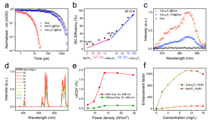 图2、(a)IR808染料在820 nm处的瞬态吸收光谱;(b)IR808修饰在Na1-xCsxY1-yLuyF4系列纳米晶表面的ISC效率;(c)在808 nm激发时,游离IR808、修饰在CsLu2F7和CsLu2F7:Yb纳米晶表面的IR808的低温时间分辨发射光谱;(d)IR808修饰CsLu2F7:Yb/Er纳米晶的上转换发射光谱;(e)不同功率密度激光激发下的绝对量子产率和(f)上转换发光增强倍数。