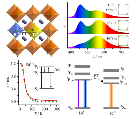 图1、基于Bi3+/Te4+共掺杂Cs2SnCl6微晶实现双带可调谐白光发射:晶体结构示意图、发射光谱、Bi3+的荧光寿命随温度变化关系曲线、Bi3+→Te4+能量传递示意图。