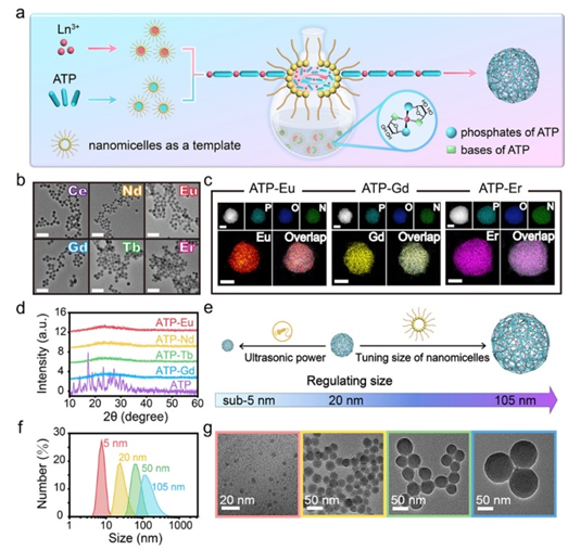 图2、(a)以纳米胶束为模板合成LNNPs的示意图;(b)用不同稀土离子合成的LNNPs透射电镜图。图中标尺均为100nm;(c)用不同稀土离子合成的LNNPs扫描透射电镜图及其相应的元素分布。图中标尺均为10nm;(d)ATP和含不同稀土离子LNNPs的X射线衍射图谱;(e)LNNPs的粒径精准调控示意图;(f)不同尺寸LNNPs的水合粒径分布图和(g)透射电镜图。