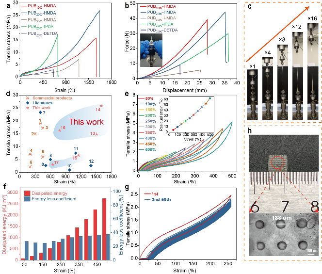 基于上述研究的进展,将高性能光固化弹性体预聚物的合成、改性及活性单体的择优遴选,与LSVP技术结合。所制备的材料具有优异的力学性能和回弹性能,其拉伸强度超过25MPa,断裂伸长率超过1600%,优于目前已报道的商业化产品和文献(图2)。同时,LSVP所制光固化3D打印的样品具有良好精度。以上工作发表在《先进材料》上,("3d Printing of High Viscosity UV‐curable Resin for Highly Stretchable And Resilient Elastomer." Advanced Materials (2023): 2304430.”),第一作者为博士生黄鲜梅,通讯作者为翁子骧高级工程师和吴立新研究员。