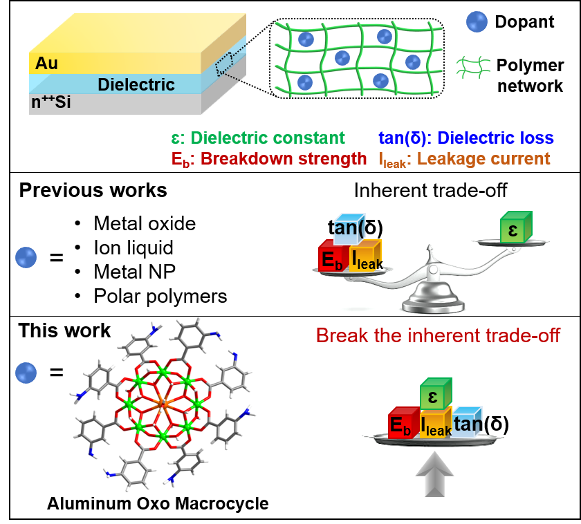 场效应晶体管(FET)是CPU、传感器和显示器的核心部件,其中,介电层对调节晶体管的整体性能方面具有至关重要的作用。目前,电介质材料仍然存在多种缺点,比如具有强偶极子耦合的铁电材料或极性聚合物电介质中的高极性基团在高电场下表现出明显的极化滞后,导致器件的高损耗。具有高介电常数的纳米颗粒添加剂虽可有效提高聚合物薄膜的电容,但同时也会增加漏电损耗并降低介电层的击穿强度。因此,聚合物介电常数和损耗之间的内在平衡已经严重阻碍了高性能聚合物介电材料的发展。