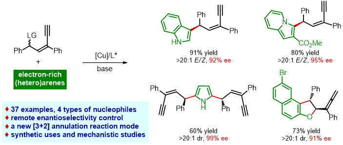 在本课题组已有报道以及其他课题组后续报道基础上,房新强课题组首次实现了富电子芳烃作为亲核试剂的高区域选择性和立体选择性不对称炔-烯丙基取代反应,从而得到一系列手性杂环取代的1,3-烯炔和联烯取代的二氢萘呋喃类产物;这些产物是有机合成的关键中间体或生物活性物质的重要亚结构。机理研究表明反应过程涉及三种模式,即单取代、双取代和首次报道的[3+2]环化反应。该工作为过渡金属催化的远程立体控制提供了新的研究思路,并丰富了生物活性分子的工具箱。
