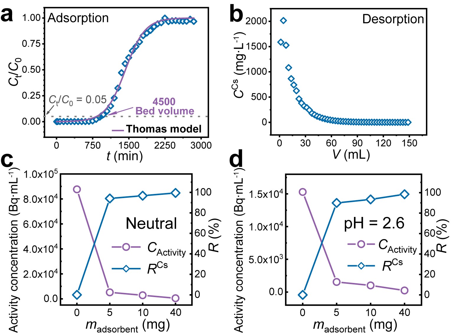 图2. (a)FJSM-KCGTS填料柱的Cs+捕获穿透曲线和(b)洗脱曲线。FJSM-KCGTS对(c)中性和(d)酸性(pH = 2.6)137Cs废液的处理能力。