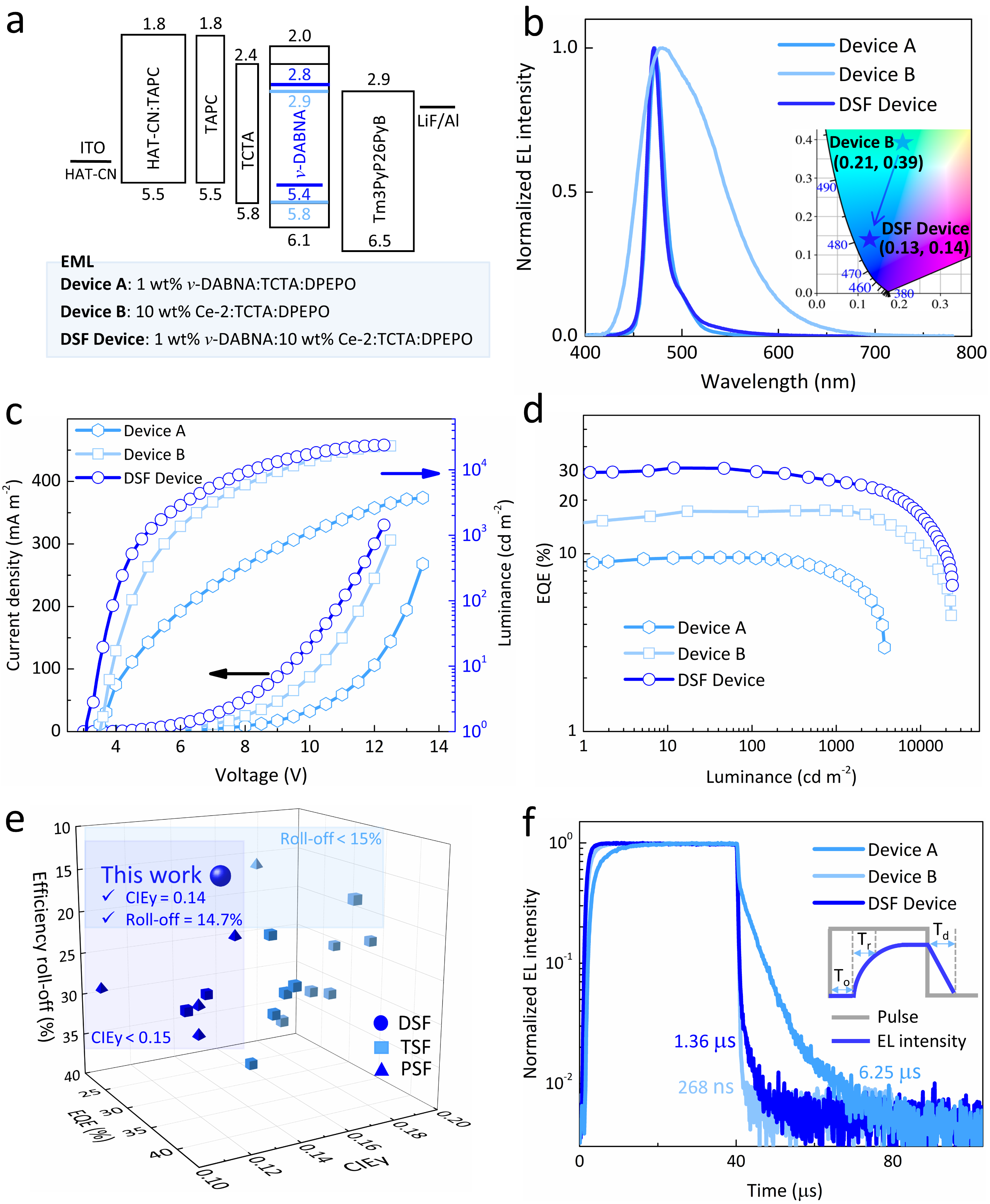 近日,中国科学院福建物质结构研究所卢灿忠团队以d-f跃迁的双线态发光稀土配合物作为敏化剂,提出并实施了蓝光OLED敏化新策略——双线态敏化荧光(DSF)。由于双线态激子生成不受限于自旋统计(电激发下,传统闭壳层材料上三线态激子:单线态激子生成比例为3:1),且双线态辐射跃迁和能量转移没有自旋跃迁禁阻的限制,该策略完美地实现了激子的高效且快速利用,从而获得高性能深蓝光OLED。